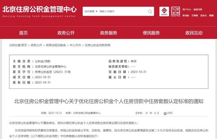 北京住房公积金管理中心10月31日发布关于优化住房公积金个人住房贷款中住房套数认定标准的通知,为支持居民刚性和改善性住房需求,体现公积金制度公平性、互助性、普惠性,经北京住房公积金管理委员会第二十九次全体会议批准,现就优化住房公积金个人住房贷款(以下简称公积金贷款)中住房套数认定标准通知如下: