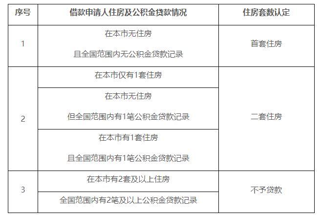 公积金贷款在住房套数认定上不再考虑商业贷款情况。如借款申请人(含共同申请人,下同)在北京市无房且在全国范围内无公积金贷款记录的,执行首套住房公积金贷款政策;如借款申请人在北京市有1套住房的,或在北京市无住房但全国范围内有1笔公积金贷款记录的,或在北京市有1套住房且全国范围内有1笔公积金贷款记录,住房记录与公积金贷款记录不论是否为同一套的,执行二套住房公积金贷款政策;如借款申请人在北京市有2套及以上住房,或已使用过2次公积金贷款的,不予公积金贷款。